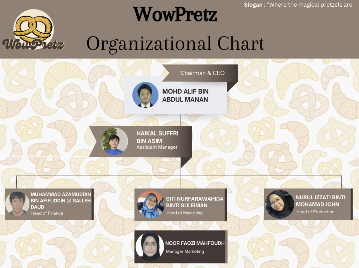 WowPretz is a pretzel company founded in 2022 by 6 students from Kota Kinabalu as part of their Business course. We are focused on selling pretzels, offering customers delicious and convenient snacks. Our mission is to provide the highest quality pretzels at the best prices. We strive to offer a wide variety of flavors and sizes to meet the needs of all customers. We take pride in our commitment to customer service and satisfaction, and are dedicated to providing the best possible experience for our patrons.